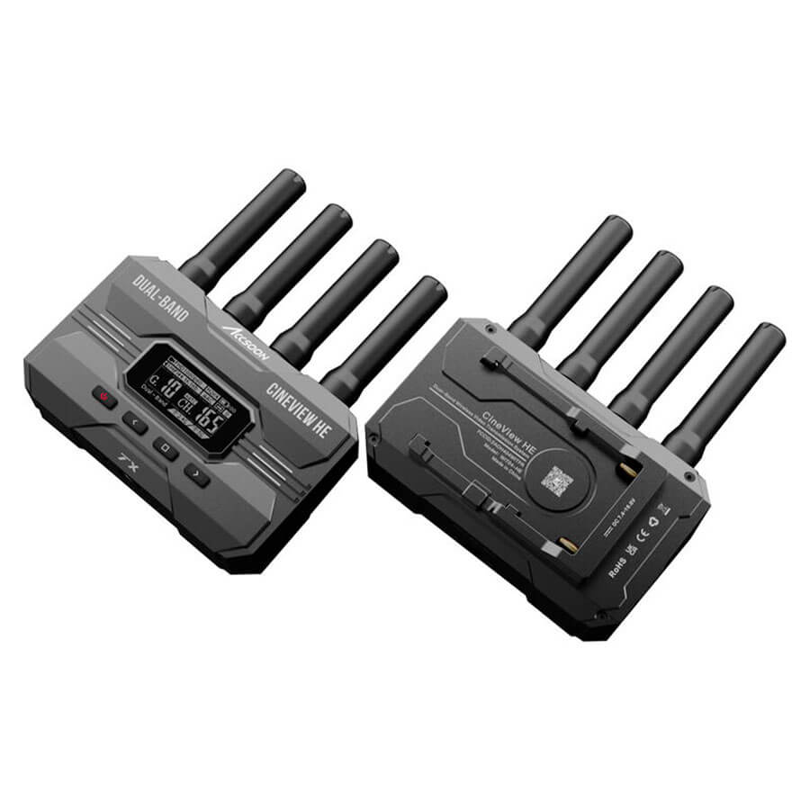 O sistema de transmissão de vídeo sem fio Multi-Espectro CineView HE da Accsoon, permite enviar um sinal de câmera 1080p60 para o receptor incluído, além de até três dispositivos móveis. Este versátil sistema de transmissão de vídeo sem fio, oferece uma maneira econômica de permitir que quatro pessoas no set monitorem um sinal de câmera HDMI. O transmissor pode enviar sinal para um total de quatro dispositivos simultaneamente a distâncias de até 365.8m com apenas 60ms de atraso. Você pode transmitir para qualquer combinação de até quatro receptores e smartphones e tablets iOS/Android, usando sinais sem fio de banda dupla.