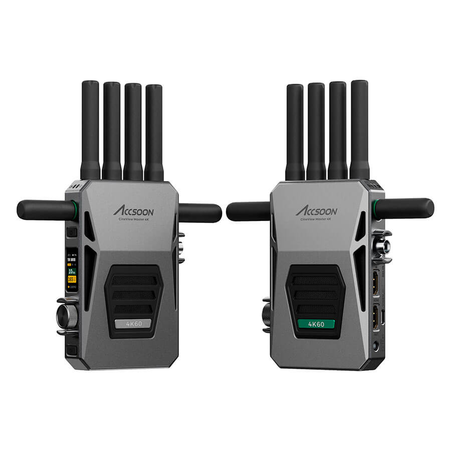 O sistema de transmissão de vídeo sem fio CineView Master 4K SDI/HDMI da Accsoon, facilita a transmissão de vídeo UHD 4K sem fio, com interface de usuário aprimorada e maior alcance em comparação aos modelos anteriores. Envie vídeo UHD 4K60 até 2,5 km do transmissor para a unidade receptora com apenas 35 ms de atraso. As conexões com fio no receptor incluem portas de saída 3G-SDI e HDMI. As conexões com fio no transmissor incluem portas de entrada 3G-SDI e HDMI, saída em loop HDMI e saída de vídeo USB-C para seus dispositivos iOS.